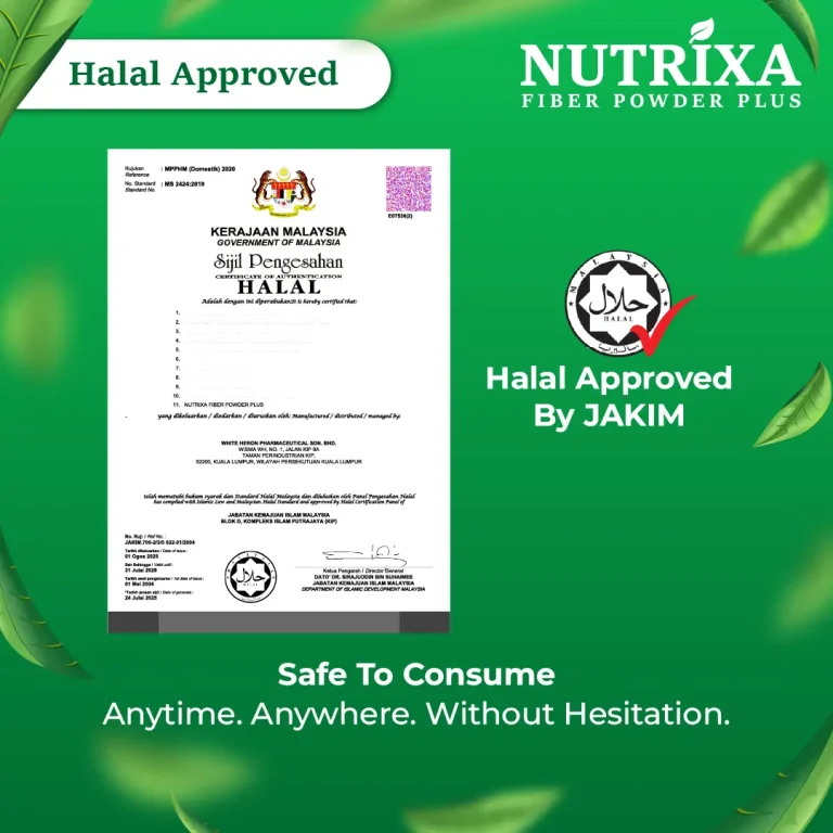 Nutrixa Fiber dihasilkan 100% menggunakan bahan natural, BEBAS STEROID & Bahan kimia merbahaya. Lulus ujian makmal untuk heavy metal & Lulus KKM